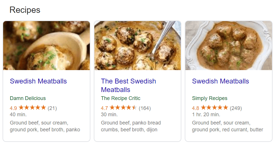 Schema markup allows your website to speak the same language as Google and search engines by using structured data. The information you provide, such as cooking time or reviewer ratings, allows the search engine to better understand your recipe, which can then be presented to users in an attractive and engaging way. With schema markup your recipes will show up in search results and images.